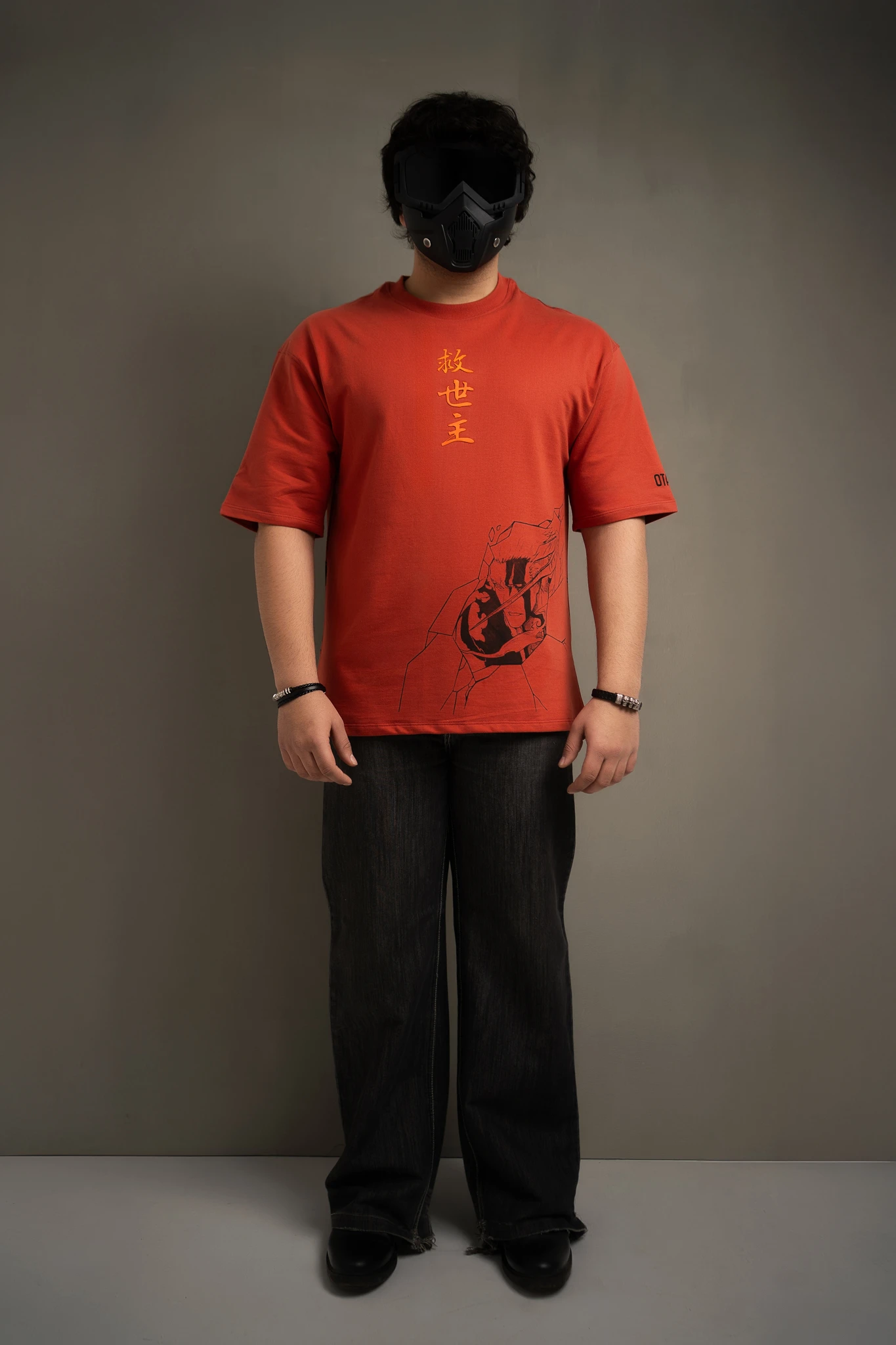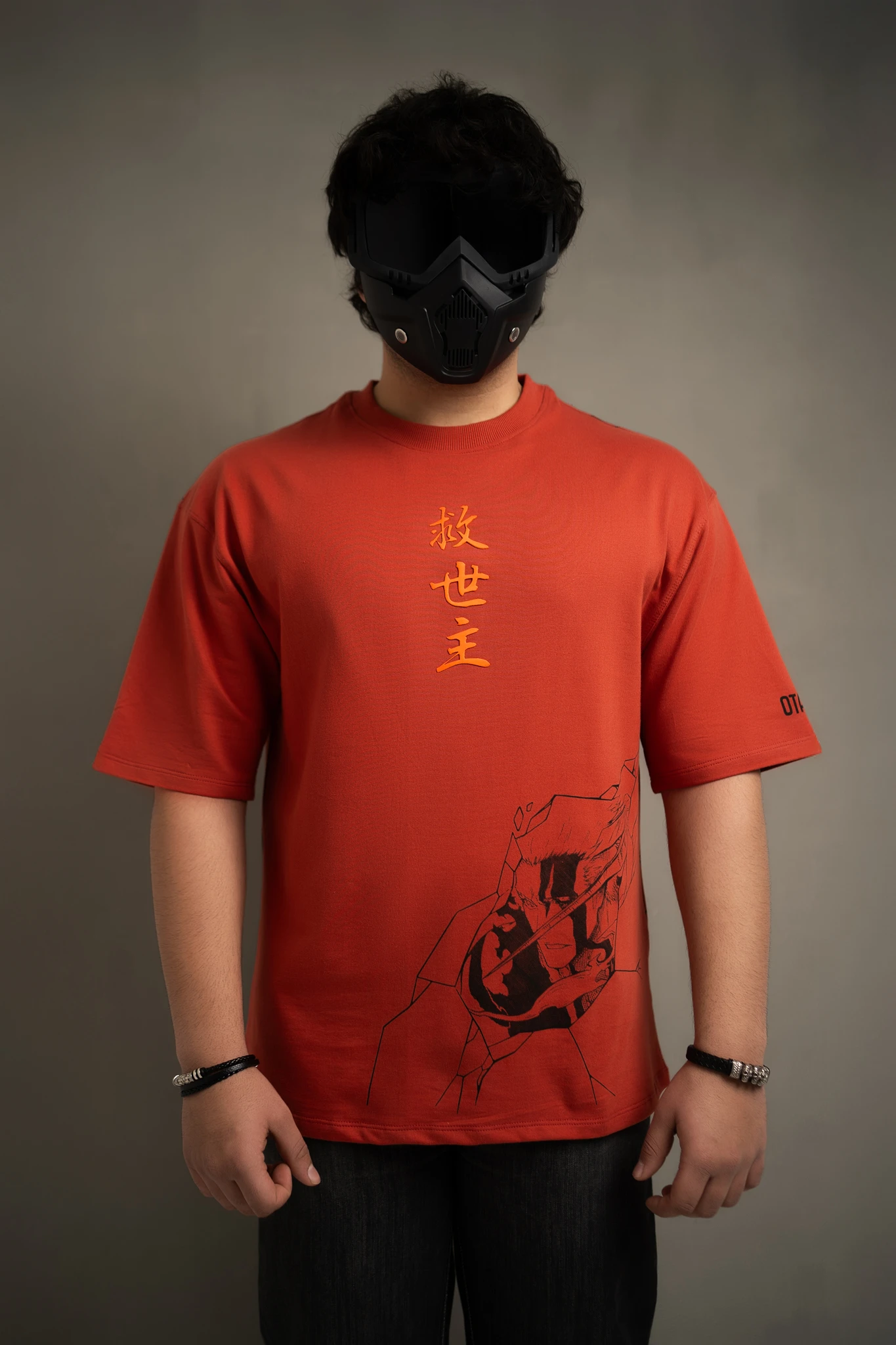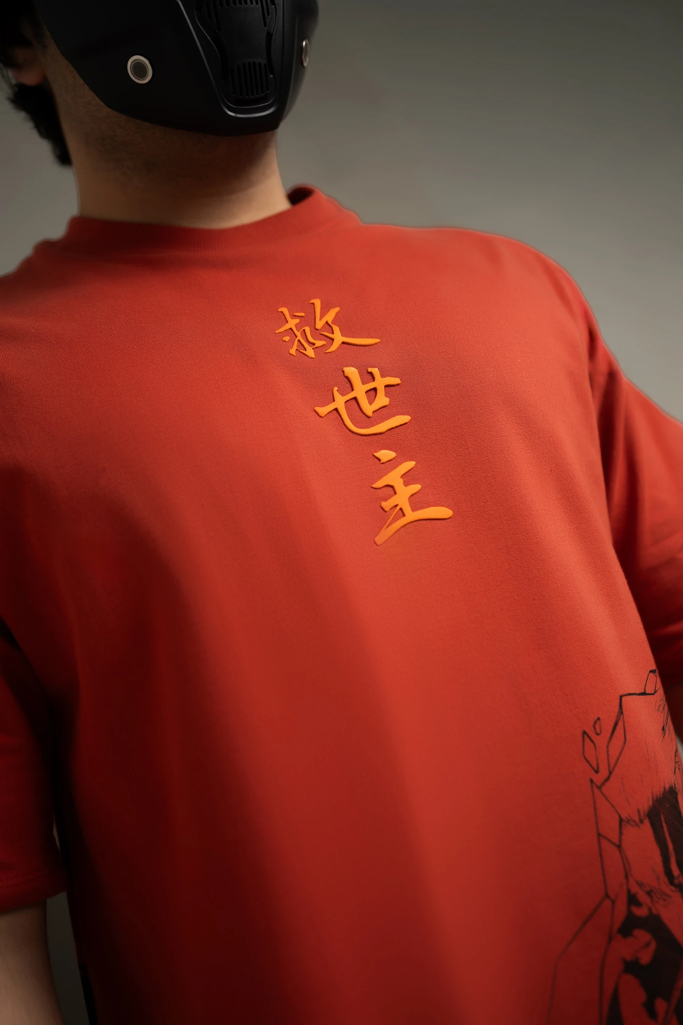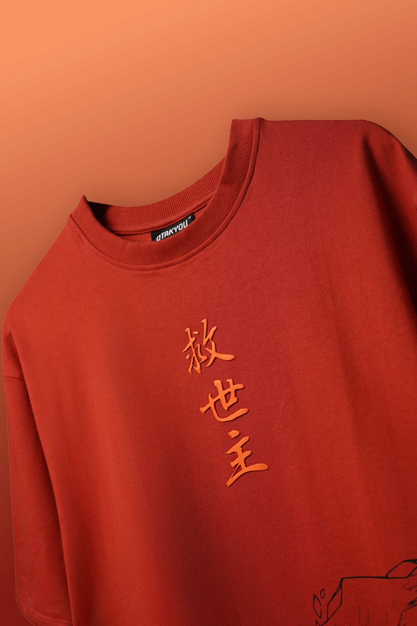 The front keeps it sharp and symbolic with vertically placed kanji in raised puff print, translating to “Savior / Protector.” The minimal placement contrasts the chaos behind, representing the one constant in Ichigo’s journey—his reason to fight.