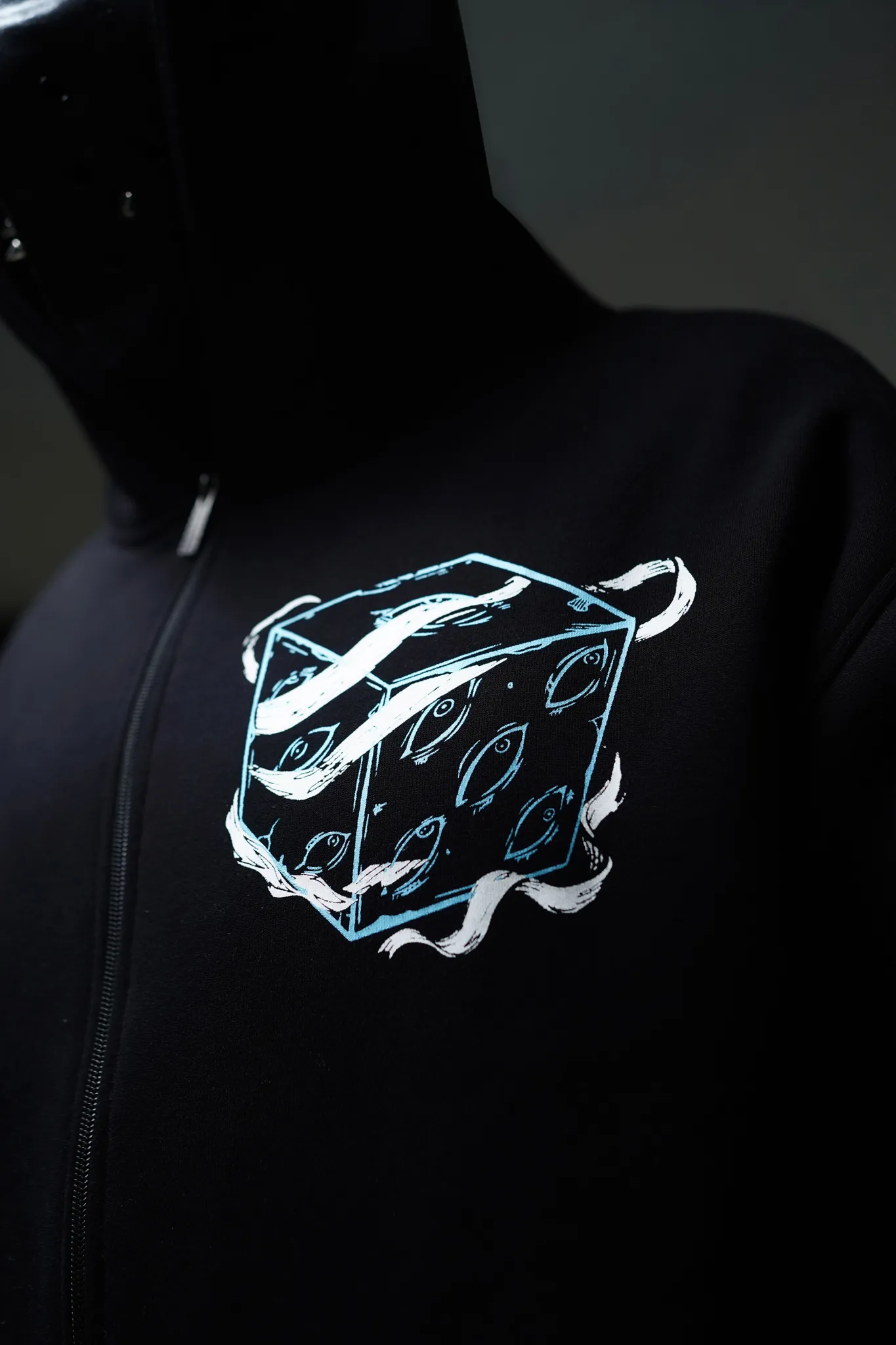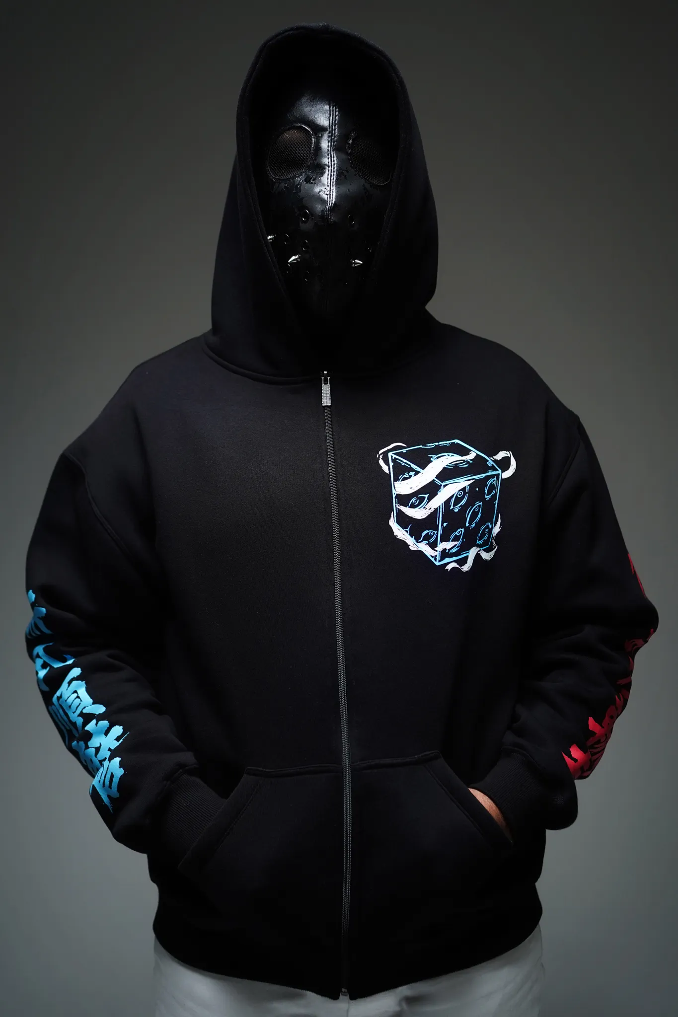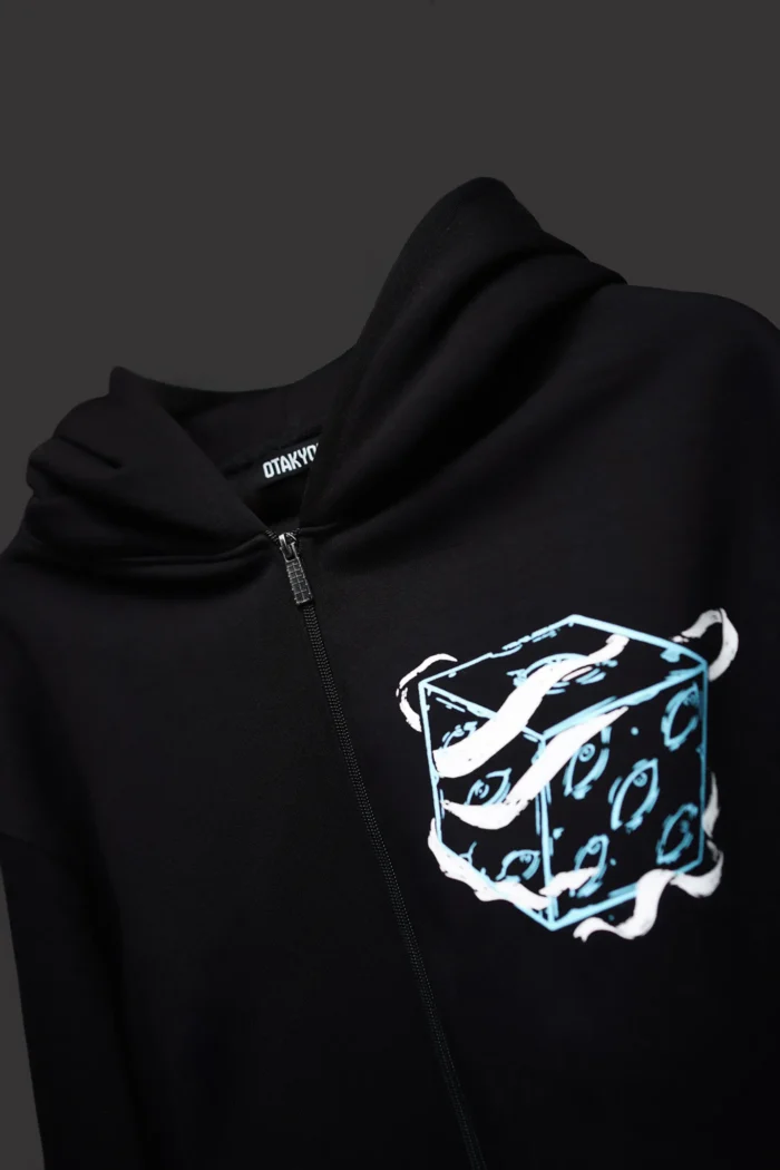 The front features the Prison Realm sealing cube — the very trap built to cage the strongest sorcerer alive. Placed like a warning sigil on the chest, it echoes the one moment the world thought it could hold him.