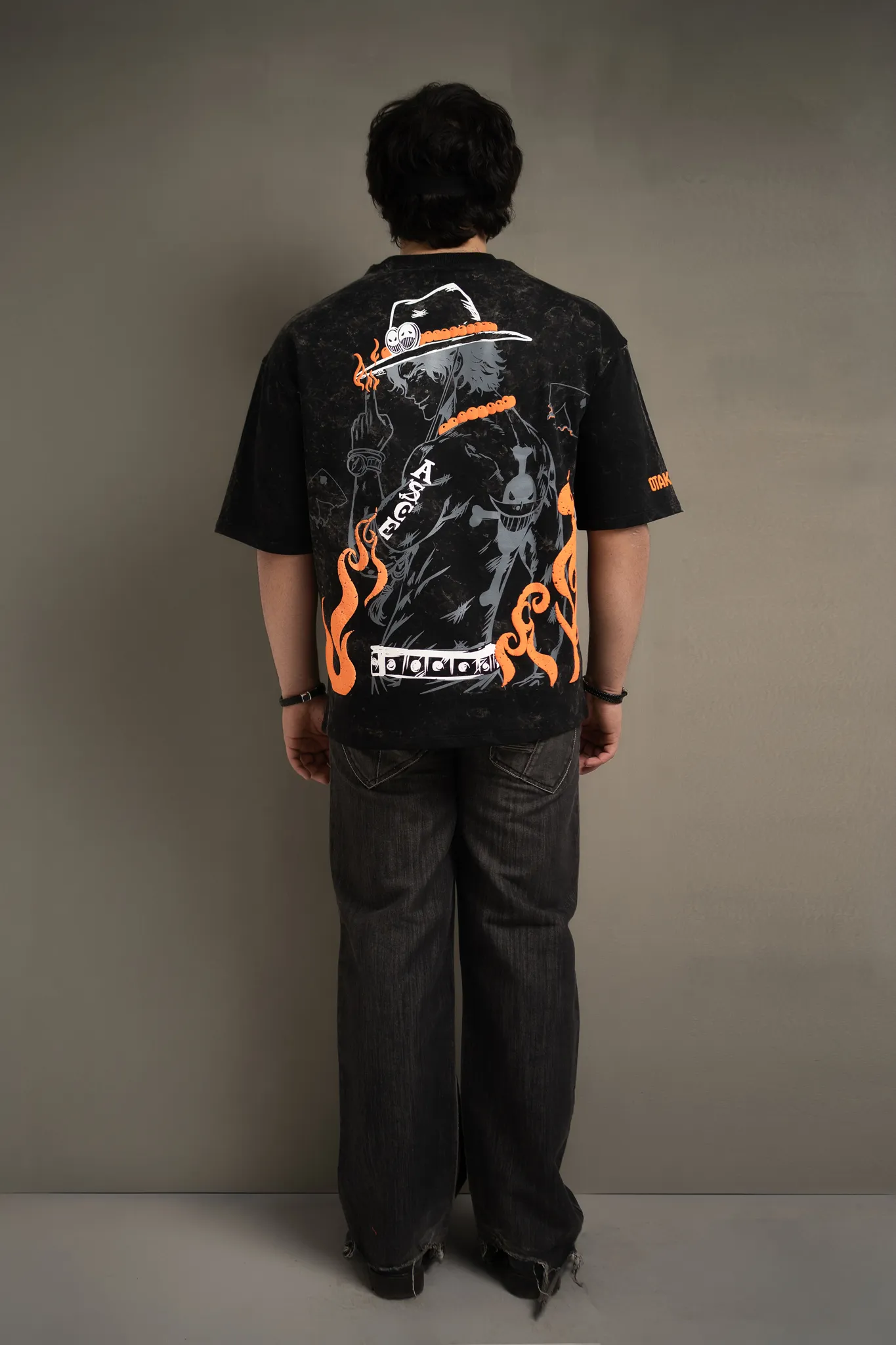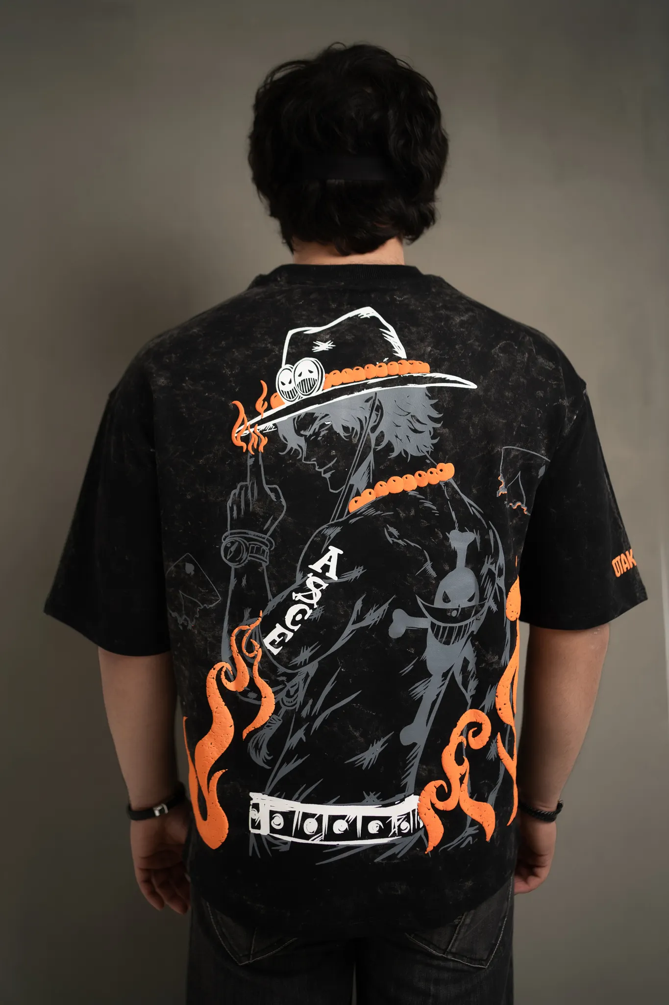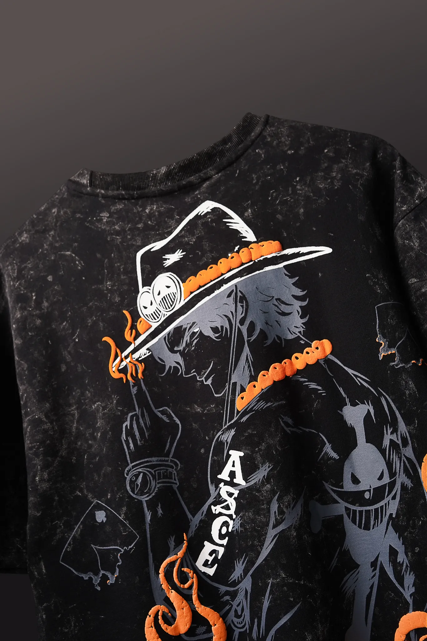 The back ignites fully. Ace stands in silhouette detail, hat tipped low, flame curling from his fingers. The signature orange puff print outlines his bead necklace and surrounding flames, creating a layered, tactile effect that feels alive under light. The Whitebeard mark and “ACE” typography anchor the design in his identity and allegiance.