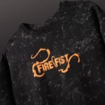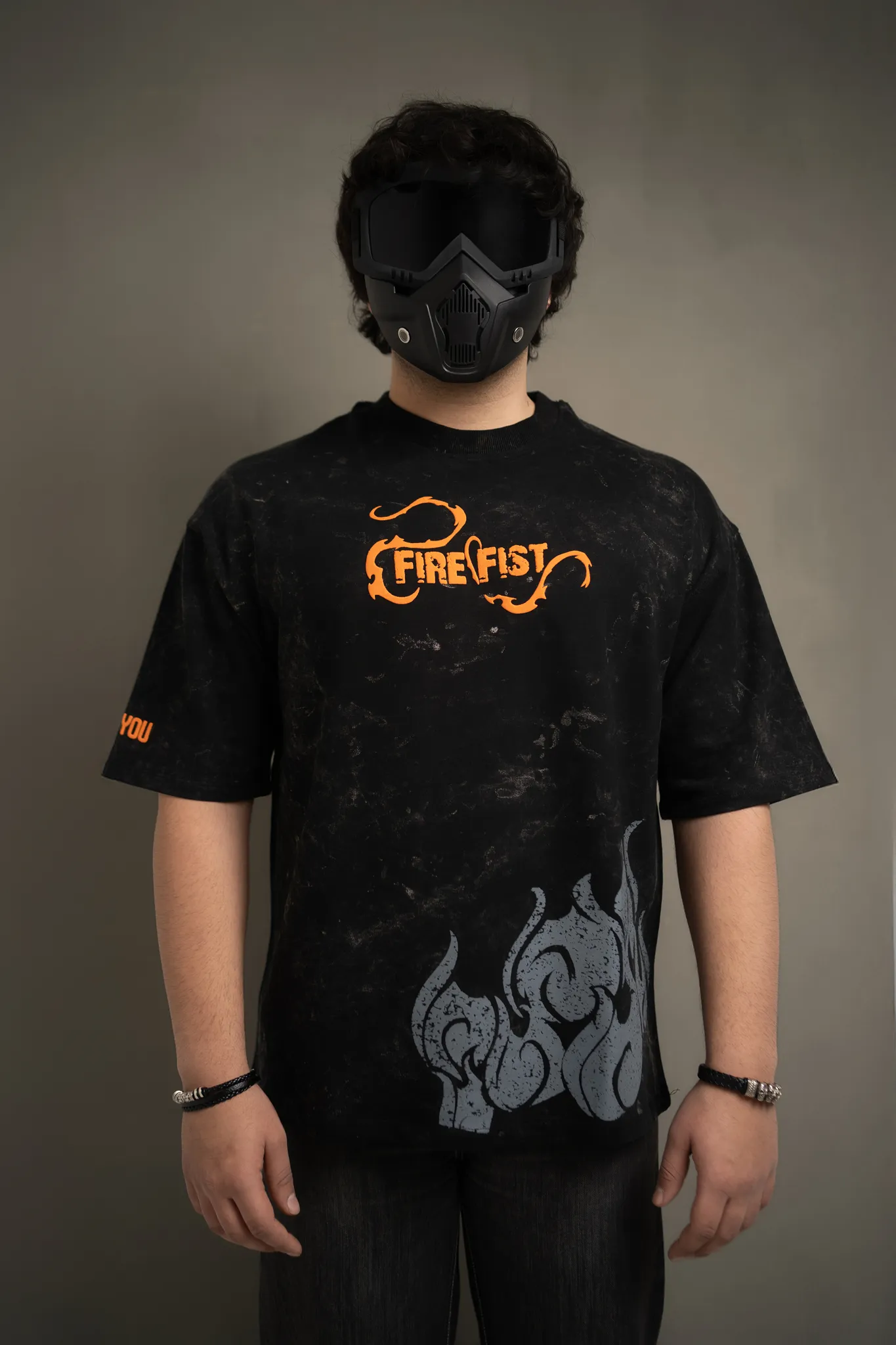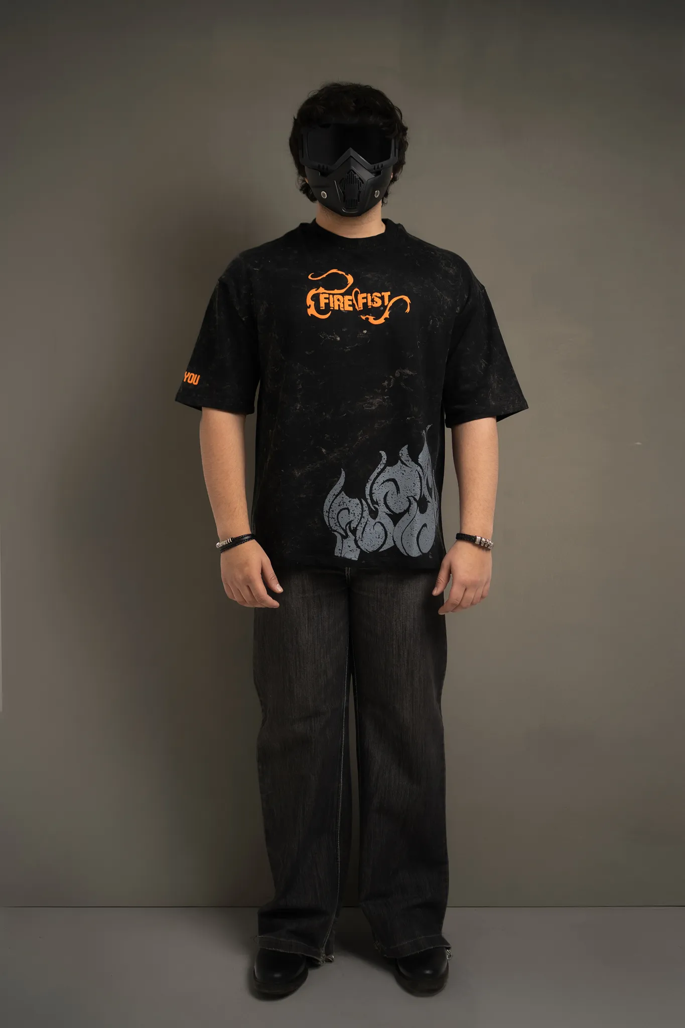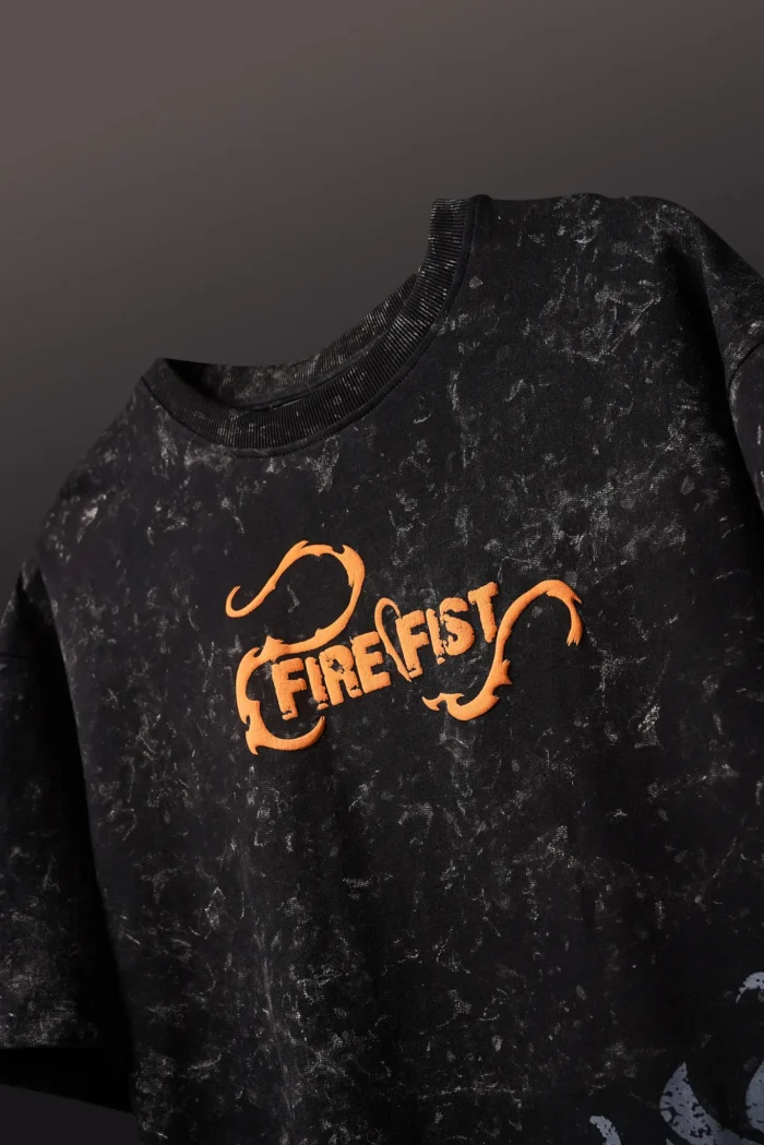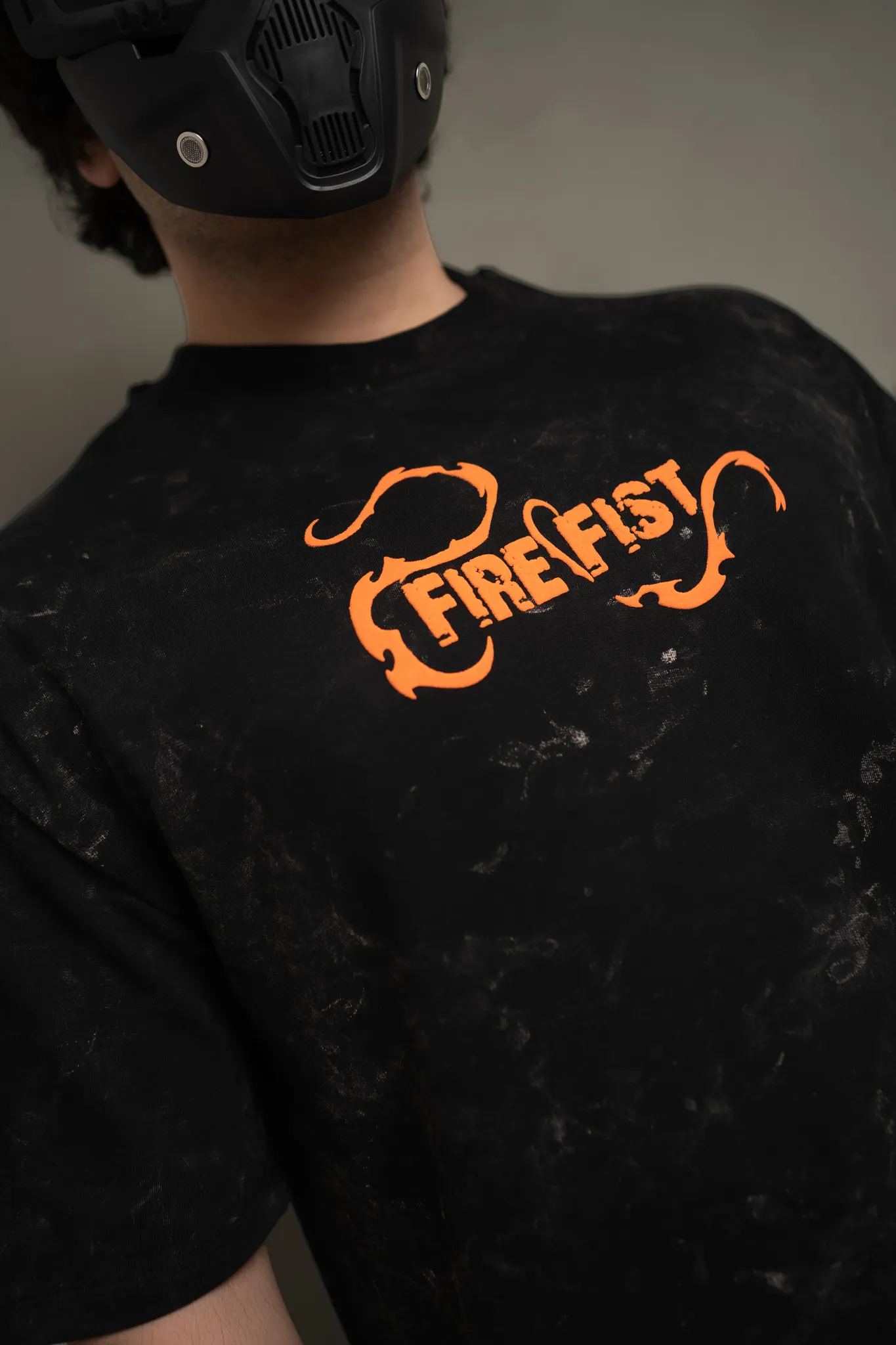 The front keeps it sharp and minimal with FIRE FIST in bold orange puff print. The raised texture gives the flames a dimensional, heat-like presence, standing out against the distressed black base. Subtle ash-wash detailing across the fabric adds a worn, battle-tested finish.