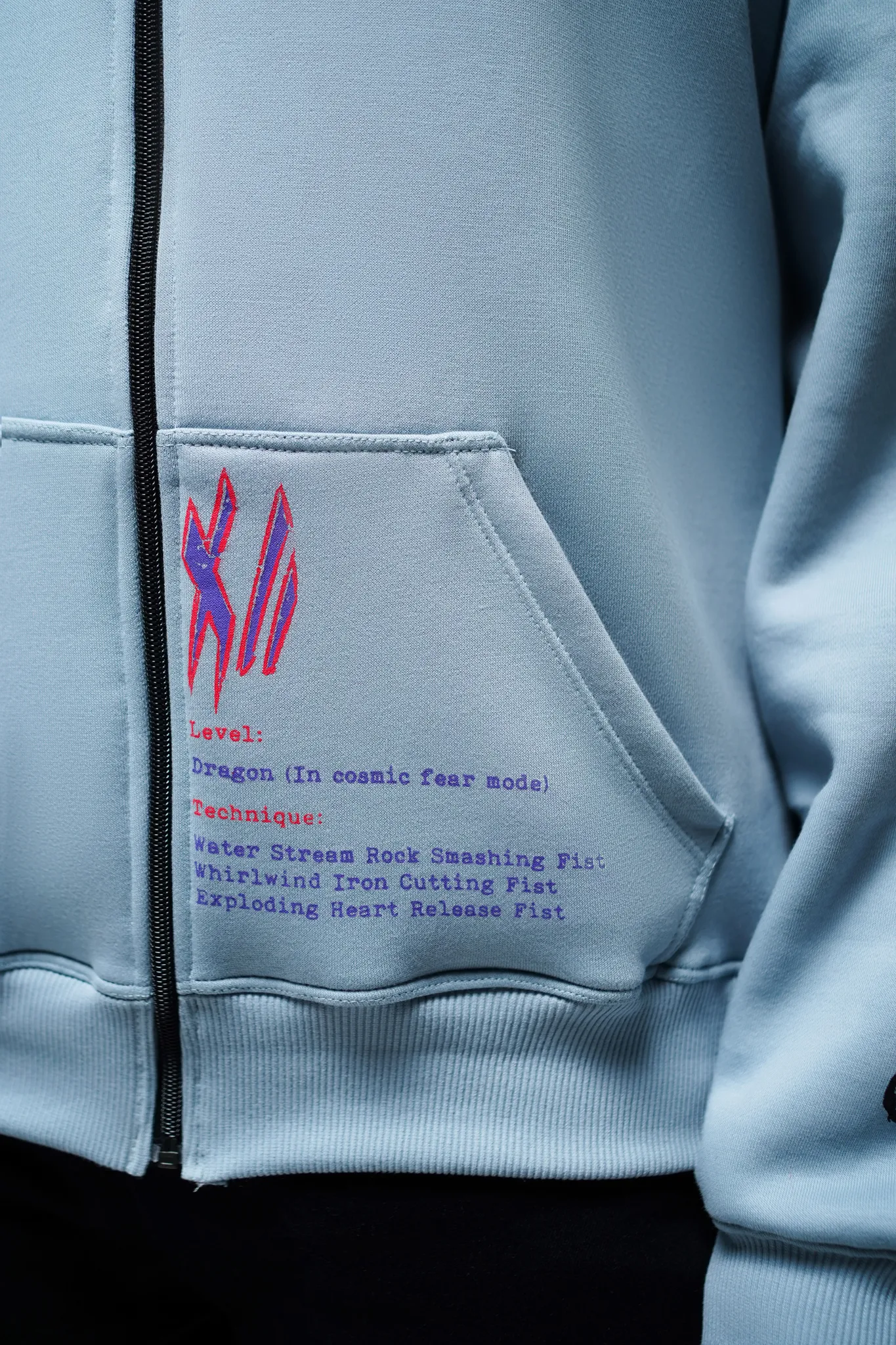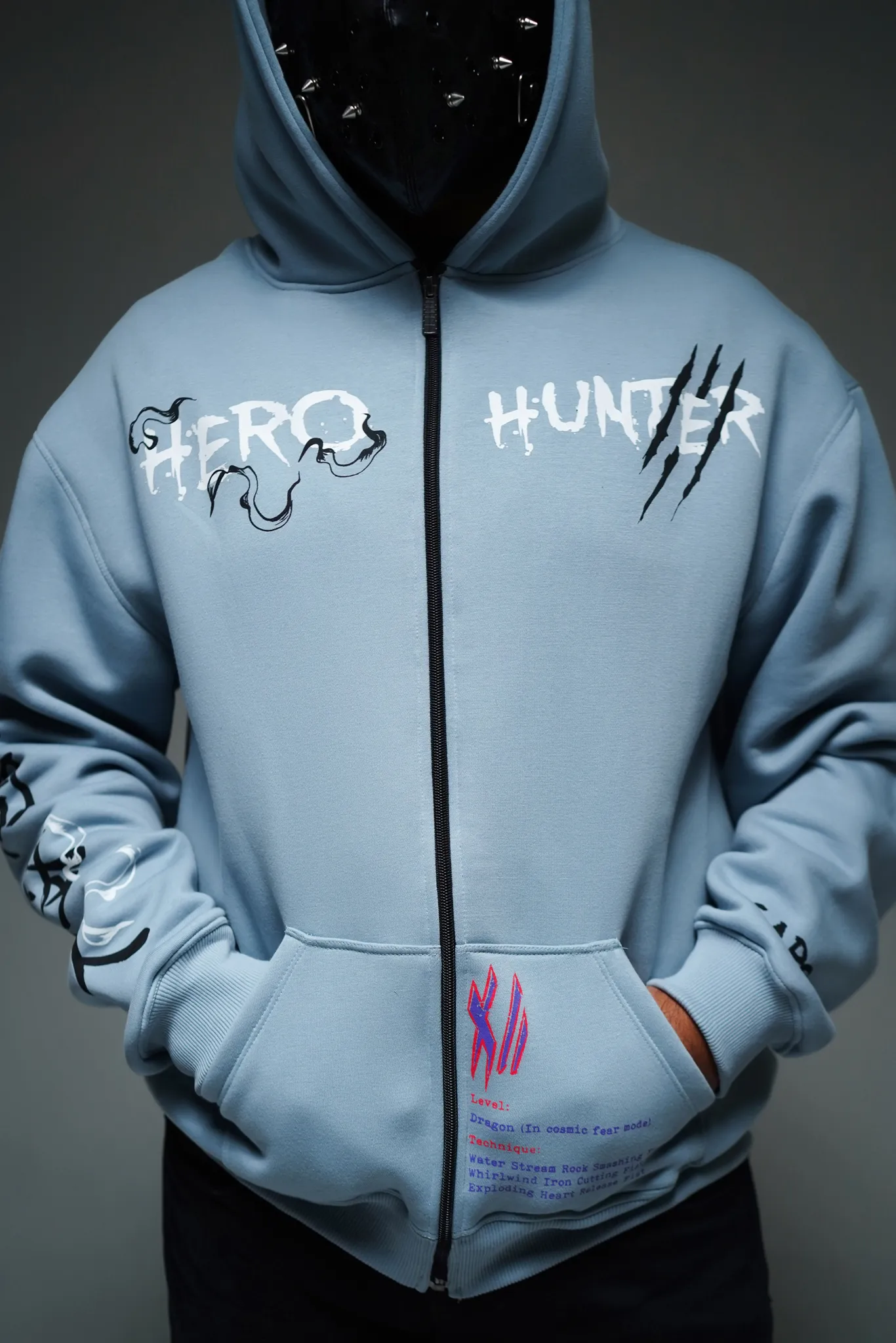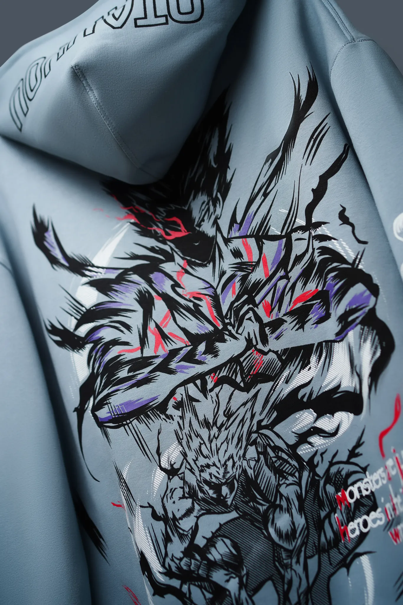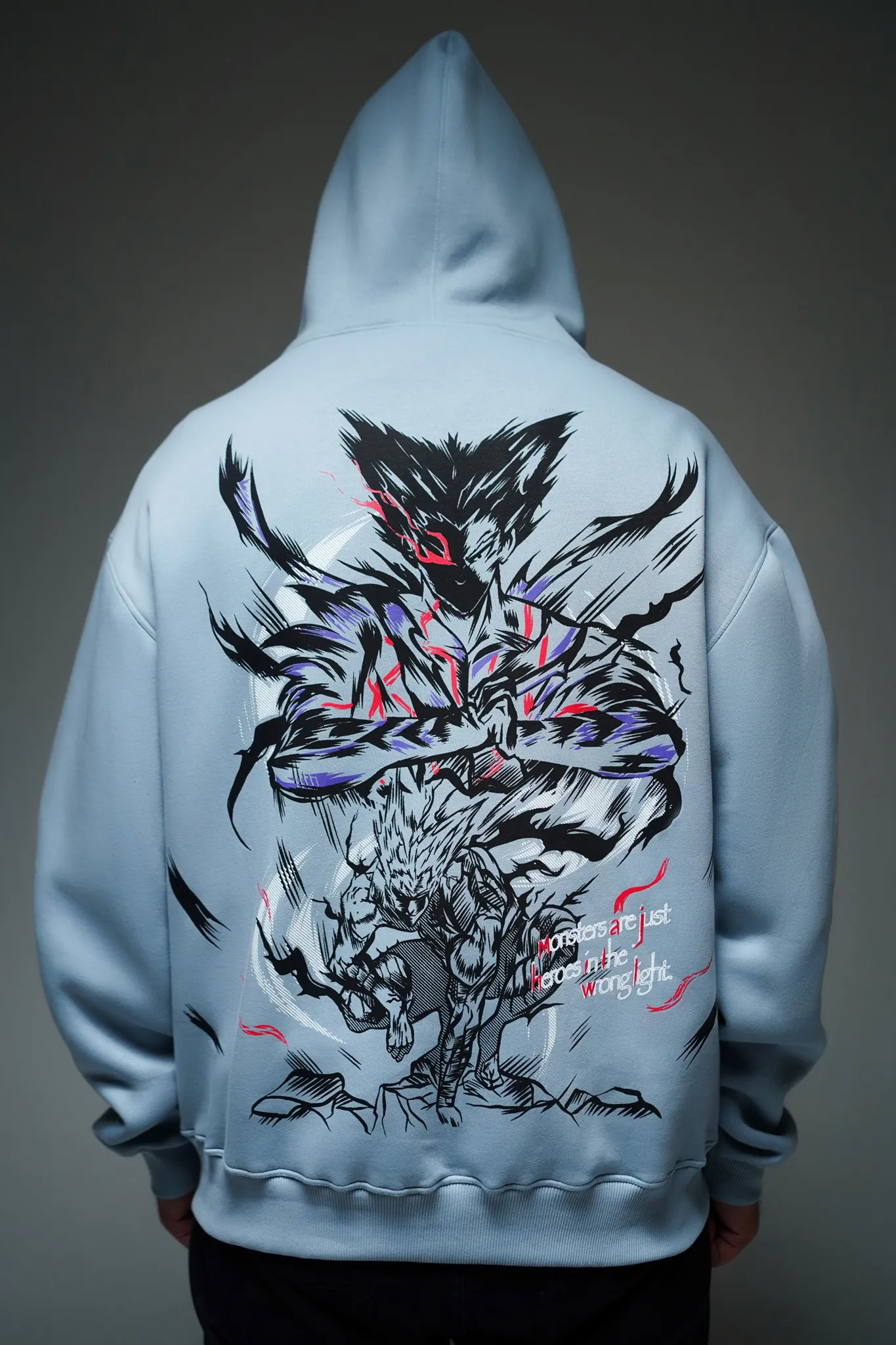 This hoodie is built around Garou’s core contradiction — the boy who wanted to be a hero, and the monster who chose to hunt them.