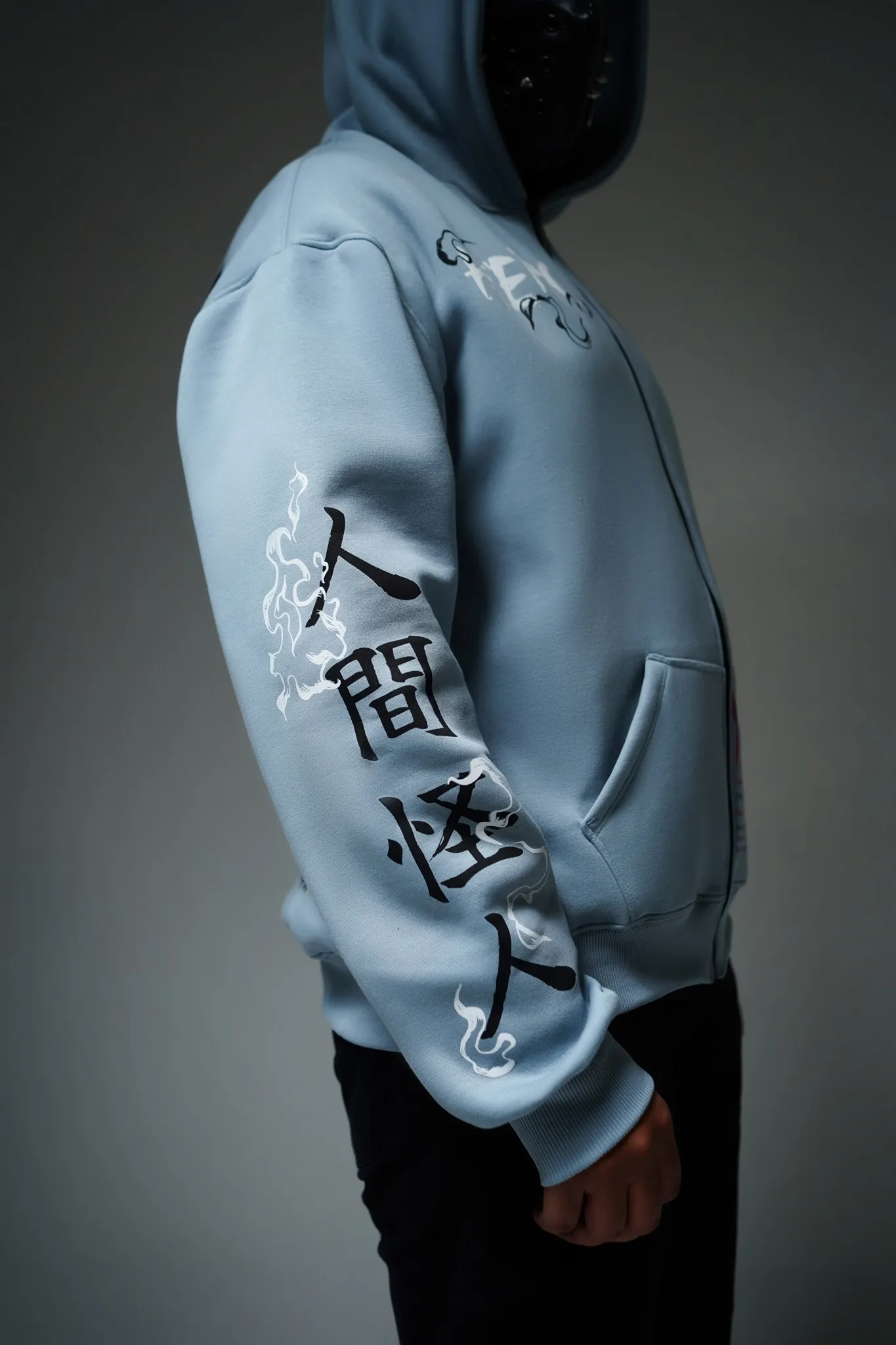 The right sleeve displays the kanji 人間怪人—“Human Monster” symbolizing the idea that monsters aren’t born, but shaped by the world around them.